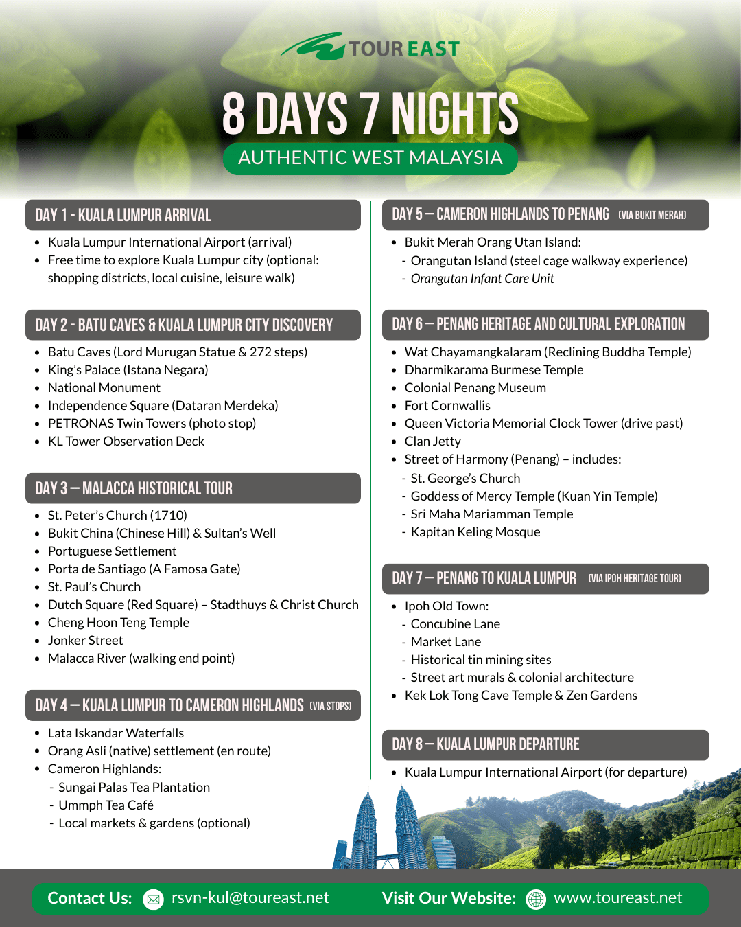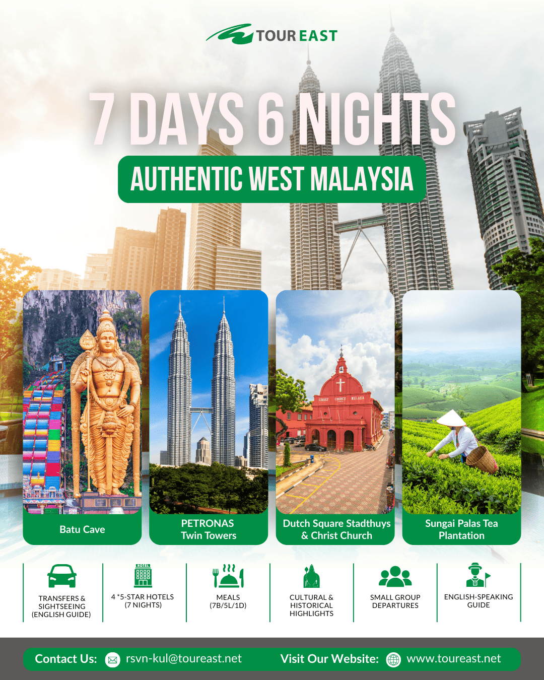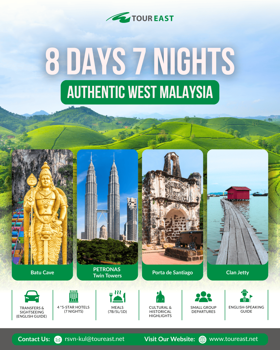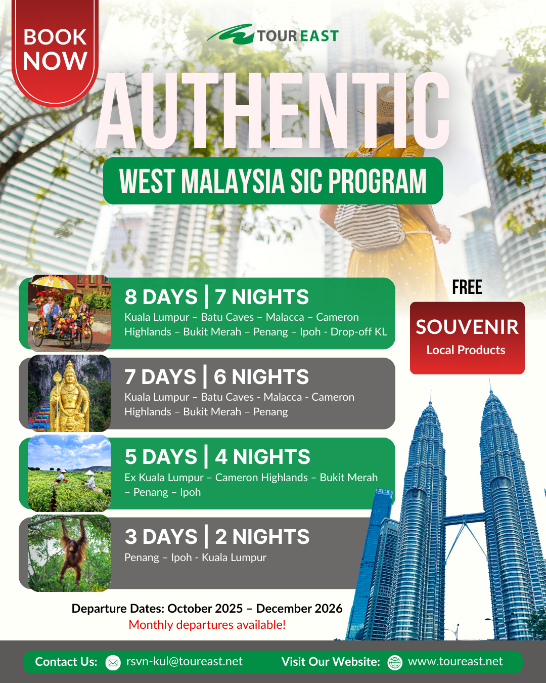 The Authentic West Malaysia SIC Program is the perfect way to experience the highlights of Malaysia in one trip. These packages bring you from the modern capital of Kuala Lumpur to the heritage streets of Malacca, the cool air of the Cameron Highlands, and the vibrant culture of Penang and Ipoh. With itineraries from 3 to 8 days, you can choose the journey that best fits your schedule while enjoying the comfort of a shared coach tour. As a bonus, each guest will also receive a free local souvenir to take home as a reminder of their Malaysian adventure!
