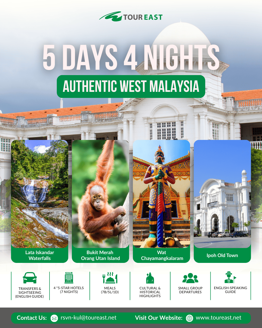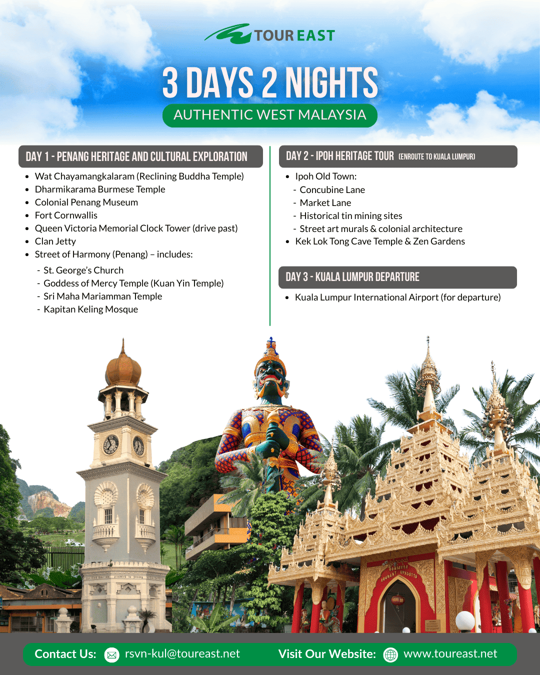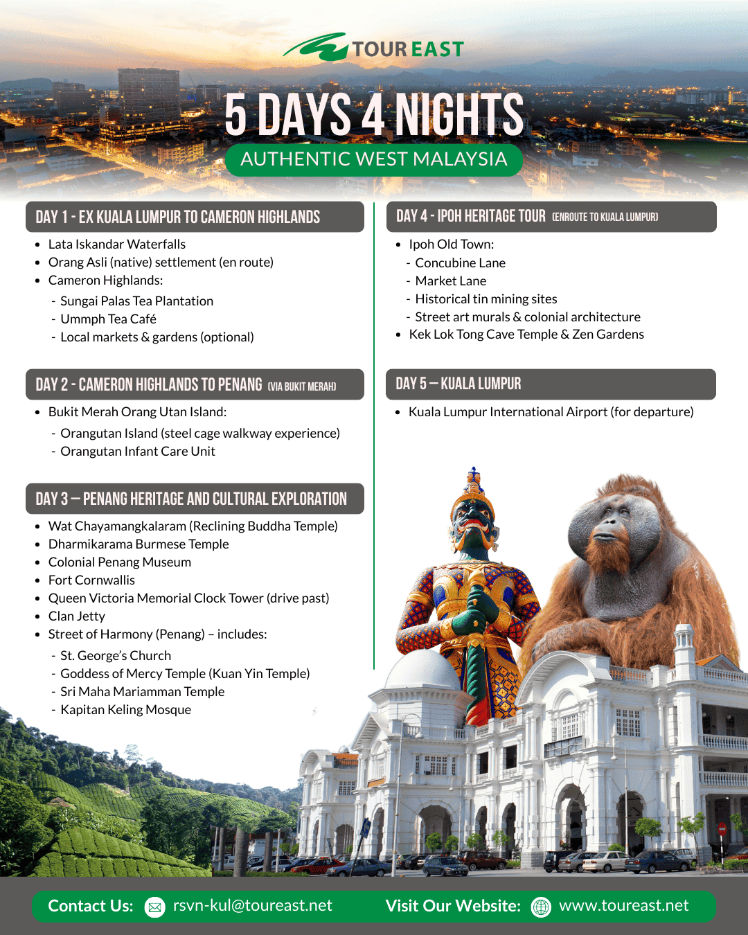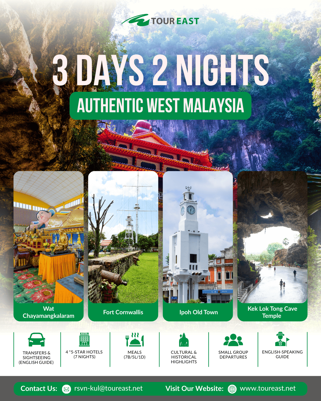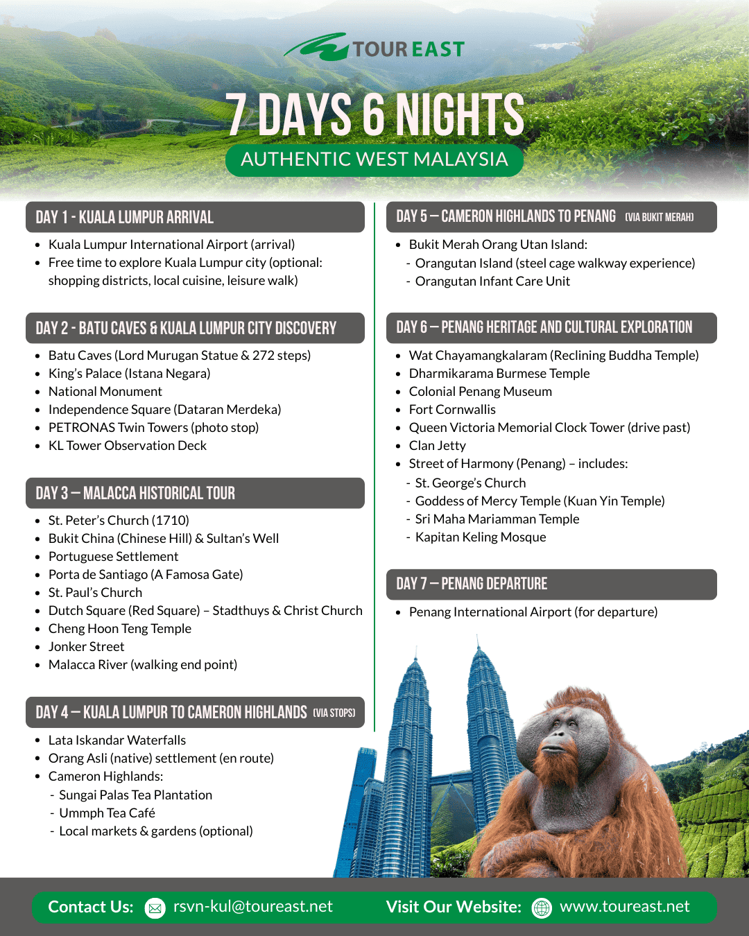 The Authentic West Malaysia SIC Program is the perfect way to experience the highlights of Malaysia in one trip. These packages bring you from the modern capital of Kuala Lumpur to the heritage streets of Malacca, the cool air of the Cameron Highlands, and the vibrant culture of Penang and Ipoh. With itineraries from 3 to 8 days, you can choose the journey that best fits your schedule while enjoying the comfort of a shared coach tour. As a bonus, each guest will also receive a free local souvenir to take home as a reminder of their Malaysian adventure!
