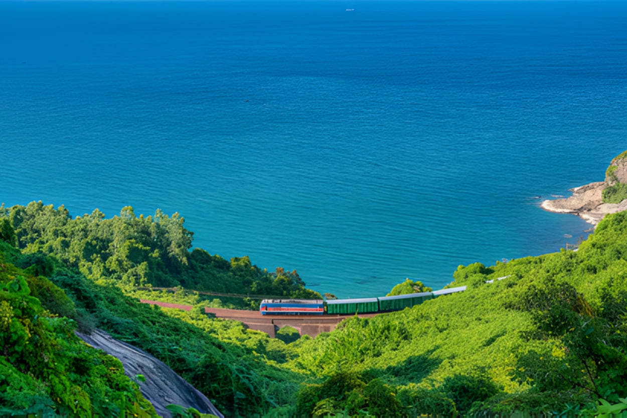 En route – Scenic rail journey along one of Vietnam’s most beautiful coastal routes, passing the Hai Van Pass and pausing briefly at Lang Co Bay