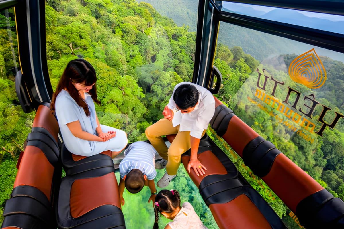 Cable Car Ascent to Huệ Quang Golden Tower: A smooth introduction to the spiritual core of Yen Tu, set above forested slopes.