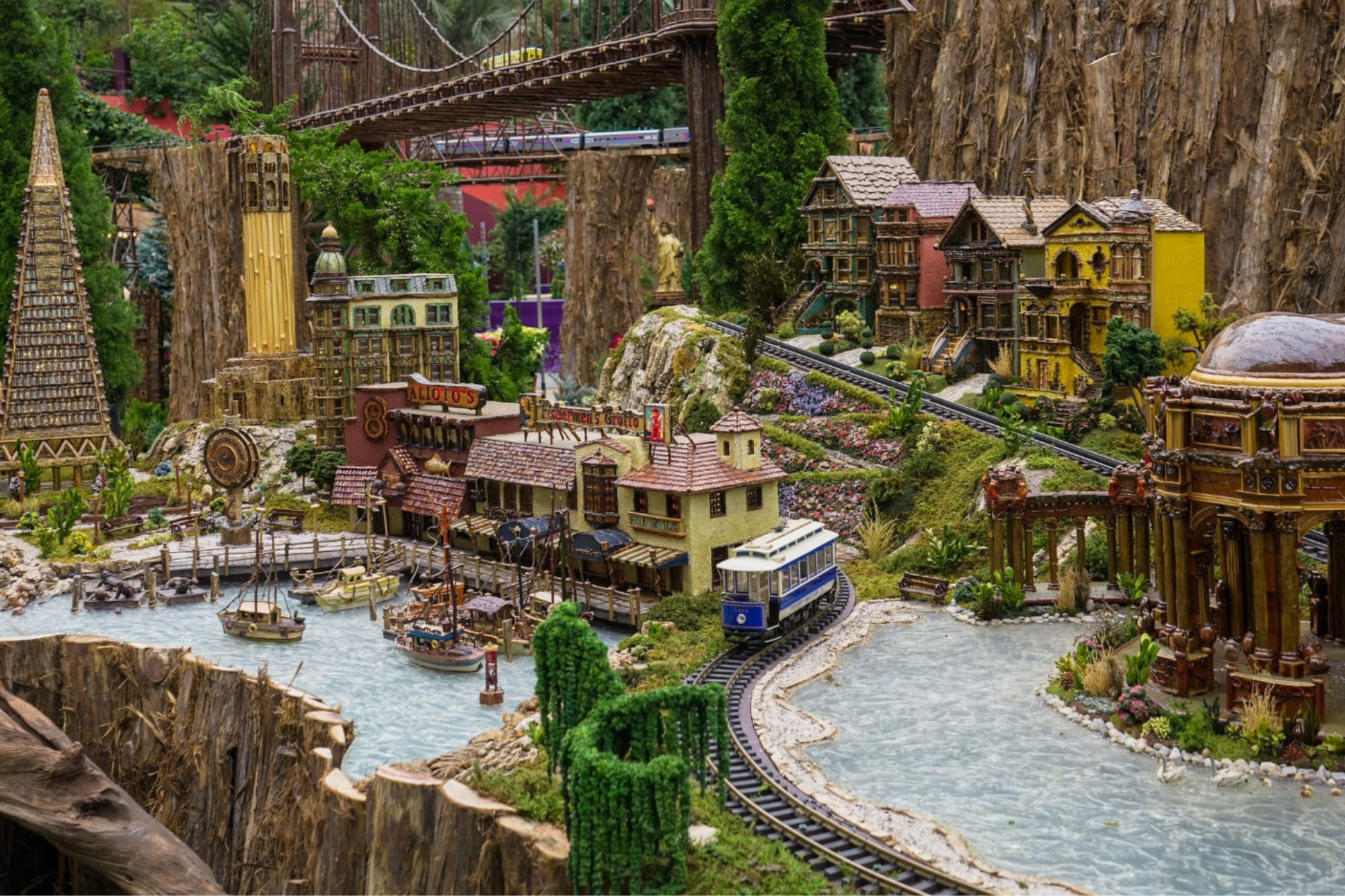 Seasonal Flower Dome display with rotating model trains on 145 metres of tracks, combining American holiday scenes with Singapore and Denmark.